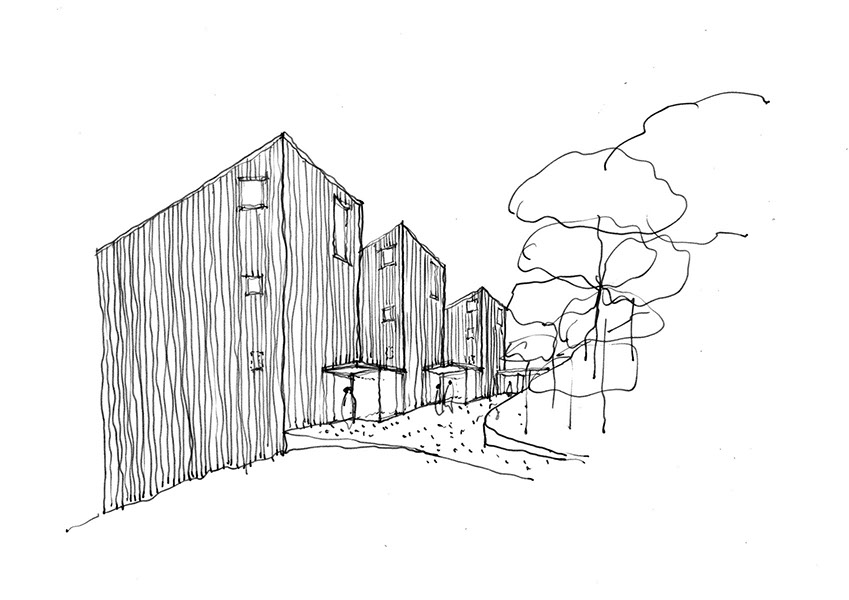Drei Mini-Turmhäuser mit je 98 m2 Wohnfläche und 26 bis 31 m2 Nebenfläche.