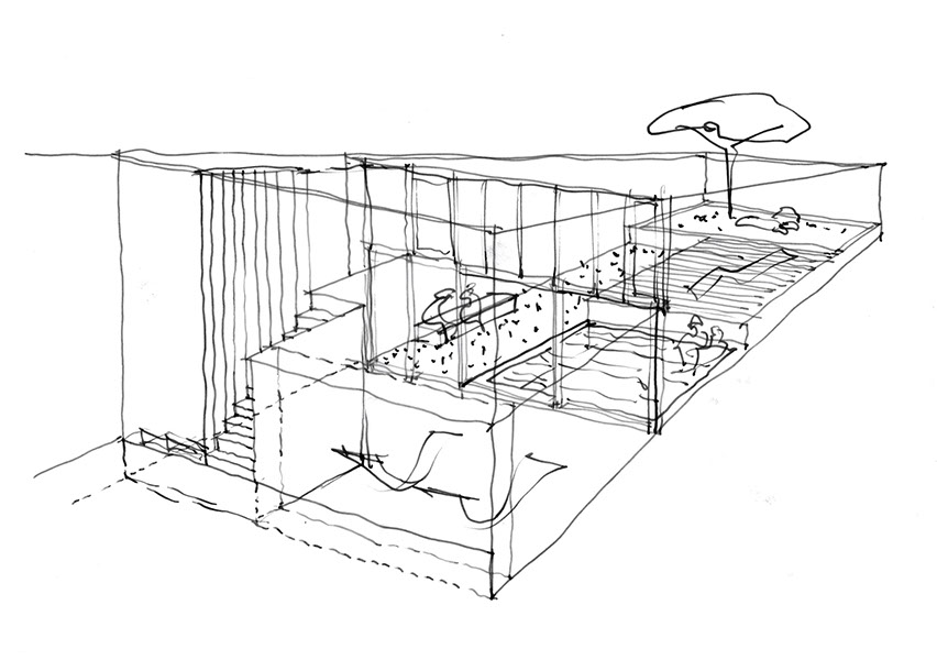 Für die Entwicklung der Architektursprache haben wir uns an Prinzipien der japanischen Ästhetik orientiert. In dieser spielen Leitgedanken wie Bescheidenheit, Gelassenheit, Heiterkeit, Ruhe und Harmonie, eine Rolle, wie auch Achtung vor der Eigenheit und dem würdevollen Altern der Dinge, Anmut, Dunkelheit, Tiefe, das Geheimnisvolle und Analogien zur Natur.